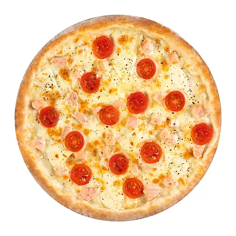 Основа,соус белый,лосось,моцарелла,сыр российский,помидоры черри.