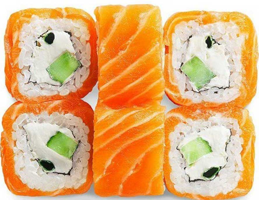 Рис, нори, лосось, огурец, омлет, масаго.